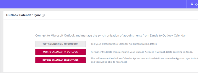 - In your Zanda practitioner profile > Calendar Sync > Outlook Calendar click the 'Revoke Calendar Credentials' button. This will remove the Outlook Calendar Api authentication details we use to background sync to Outlook. It will not delete the Calendar in Outlook and you will be able to reconnect.
