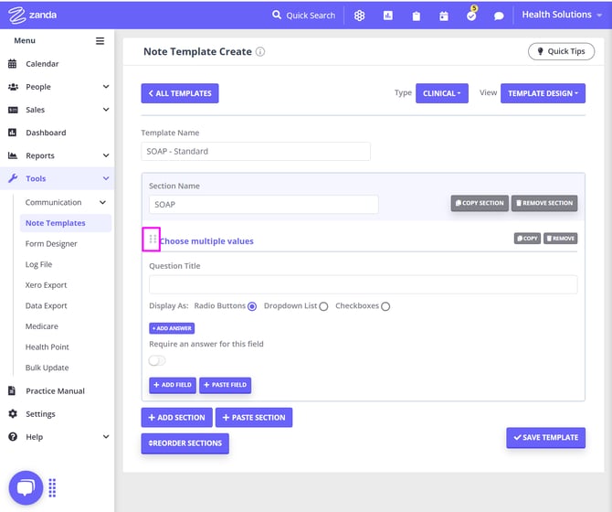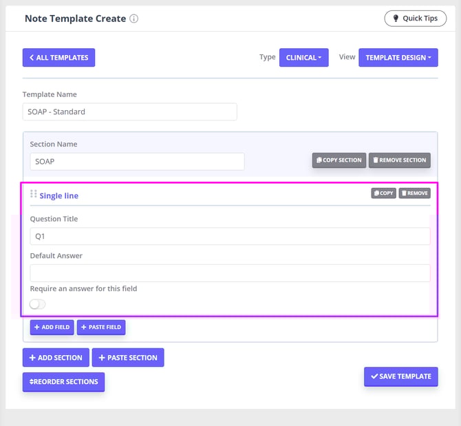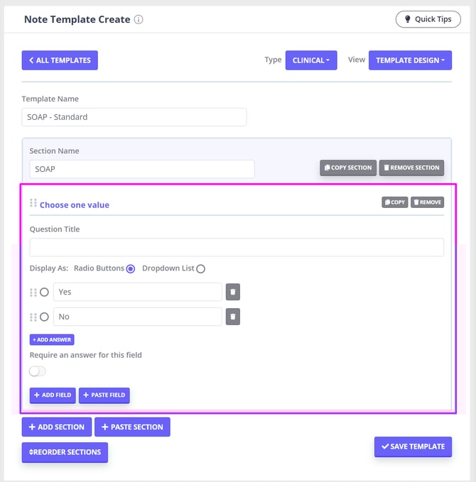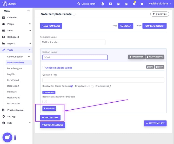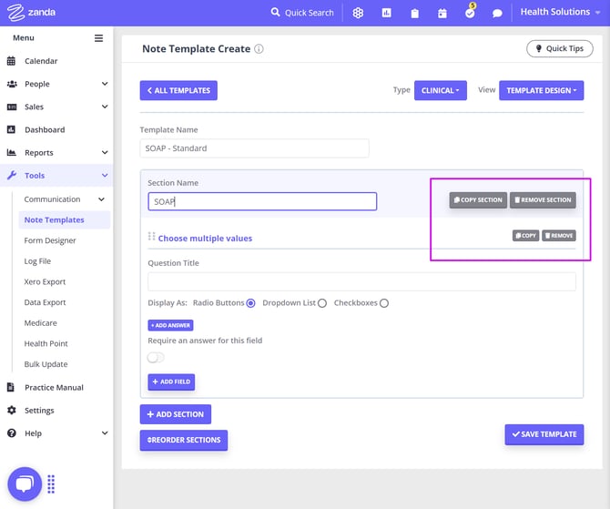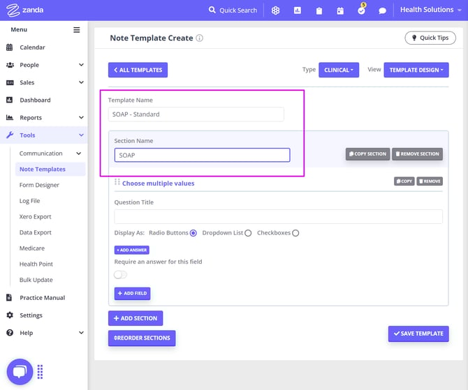 - A note template is comprised of sections and fields. You can add more sections to the note using the '+ Add Section' button.