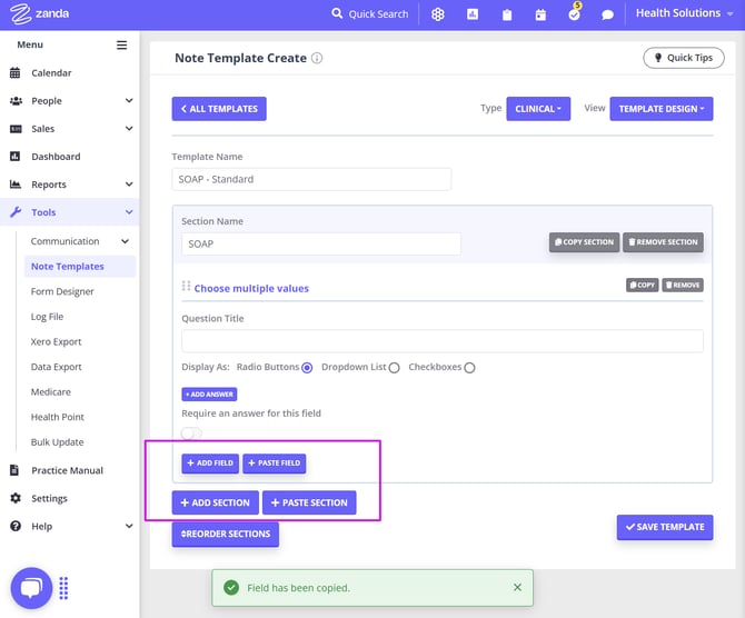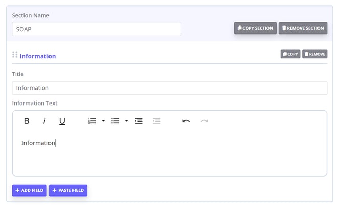 - Sections and fields you copied will be available for pasting via the buttons below on the left. You will then be able to make changes to a copied filed. This feature improve your efficiency when you need to create a note with similar fields.