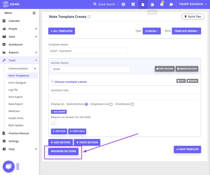 - Use the 'Reorder Sections' button to move the sections around to the desired location.