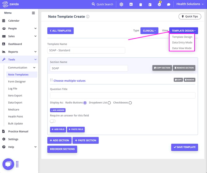 1. When you're creating or editing a Session Note template you can preview how the template will look when either: using the template to create a note for a client (Data Entry Mode); or how the template will look once it has been saved to a client's record (Data View Mode).