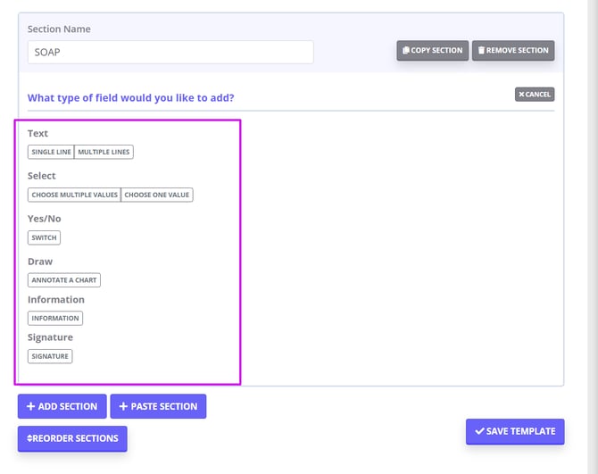 There are several fields to choose from to add to your note template. In the sections below we will describe how each of these fields function and can be used in your notes.