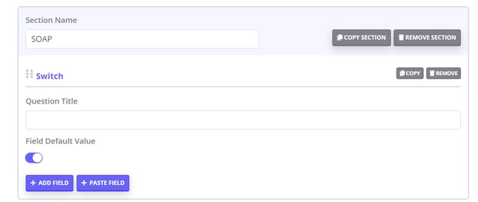 Switch: A toggle option (that is either active or inactive). Generally used for questions that can either be answered with a Yes or No or True or False response. Enabling the Field Default Value means it will stay Yes or True unless toggled.