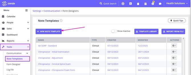- Depending on your user access level, navigate to Tools > Note Templates or Settings > Session Notes > Note Templates: