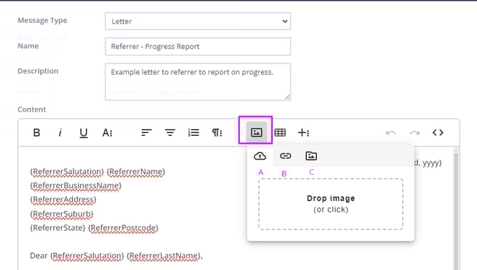 1.In the Content block, click the Insert Image button on the toolbar'.