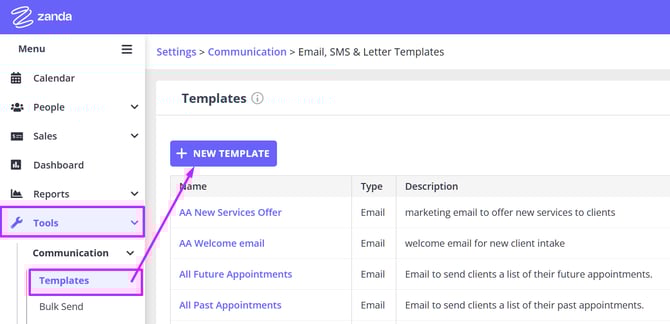 Your Zanda account comes pre-loaded with commonly used communication templates. Go to Tools > Communication > Templates to see the templates, and customise them as per your requirements instead of creating one from scratch.