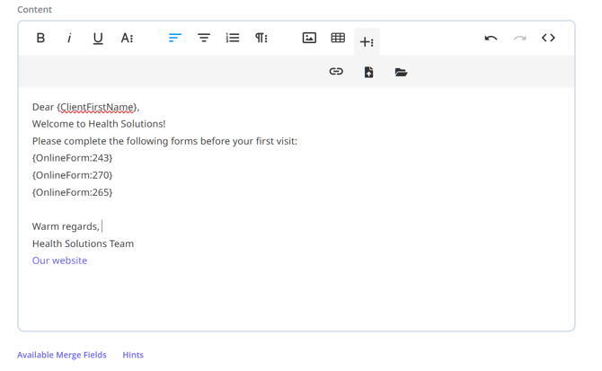 2. Return to your template and paste the online form merge field where you want the link to appear. This merge field will generate a unique online form in the client’s profile whenever you use this email or SMS template, and will automatically add a clickable link to the message that is sent to the client.Note💡