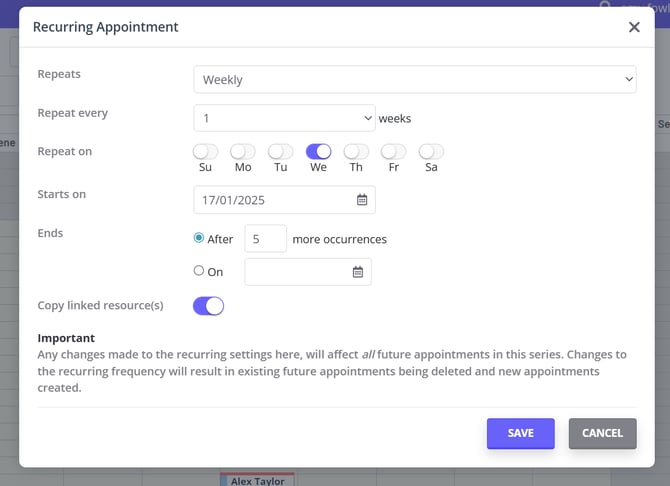 - Copy linked resource(s): Enable this option to automatically copy any resources linked to the initial appointment across all appointments in the series. You can update these copied resources for individual appointments in the series as needed.