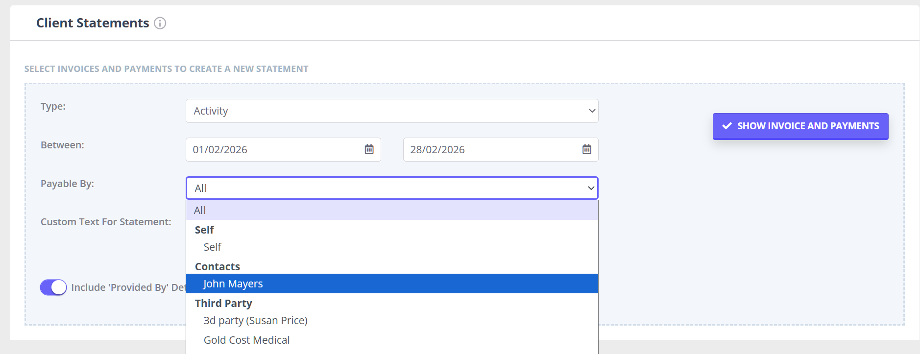 - Based on this selection, the statement will include client invoices billed to the selected payee, and payments received from the selected payee. This will be reflected in the 'Invoice To' section of the generated statement.