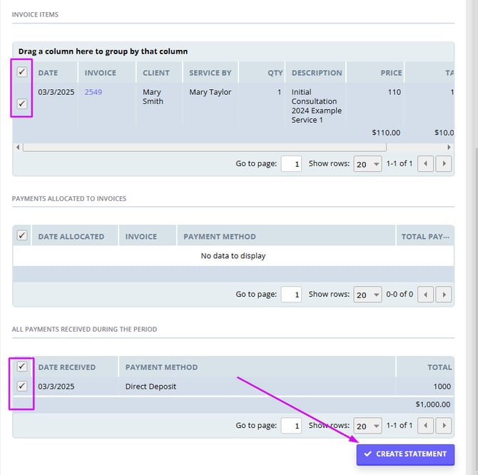 5. Tick the invoices and payments which you would like to combine into the statement.