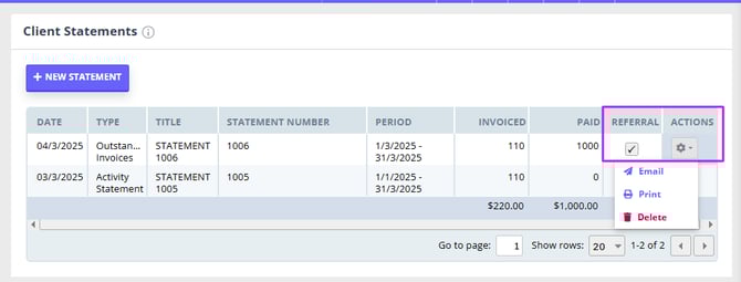 - Once you have created your statement you have the option to show the referrer on the statement, which you can do this by ticking "Referral". This will show the referrer details at the top right hand of the statement (the same place that it is shown on a normal invoice).