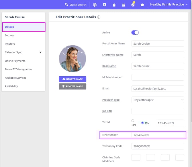 - The NPI number entered in the 'NPI Number' field in practitioners' profiles will appear below the practitioner name on all invoices and superbills when printed or downloaded.