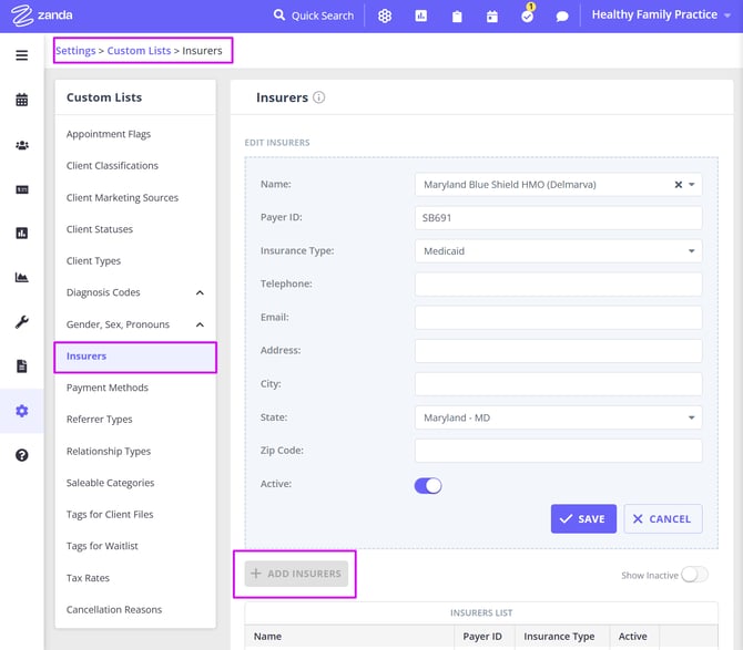 - Navigate to Settings > Payments > Insurers > + Add Insurers.