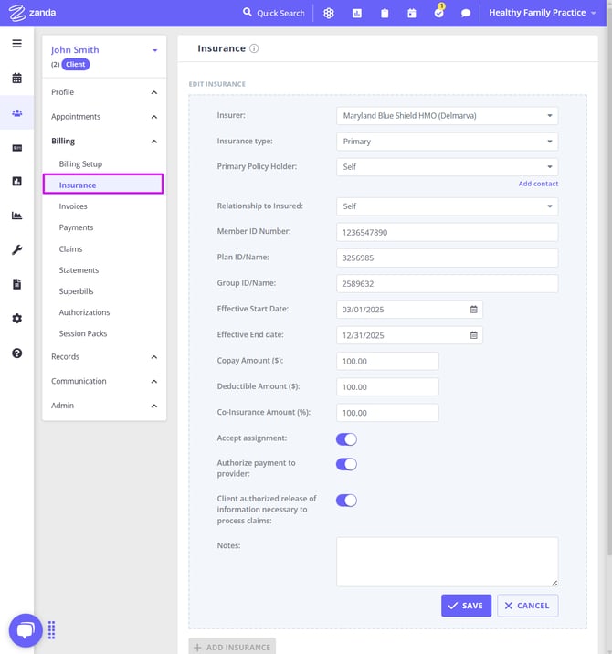 - You can then use this insurer to add policy numbers or insurance numbers to clients' profiles. To do this:
