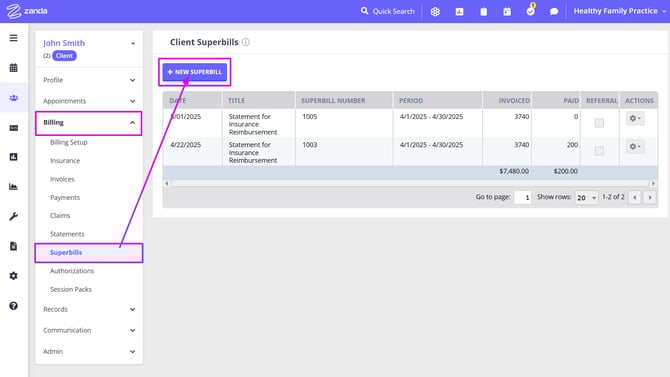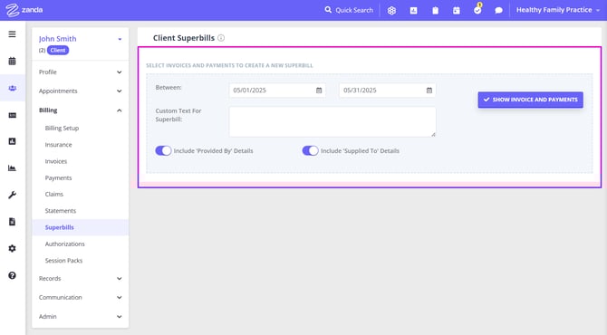 You're able to customize your client setup and invoices to create superbills in Zanda for insurance claims.