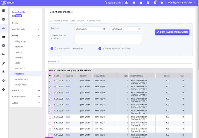 5. You can untick any invoices that you don't want to be included on the superbill.