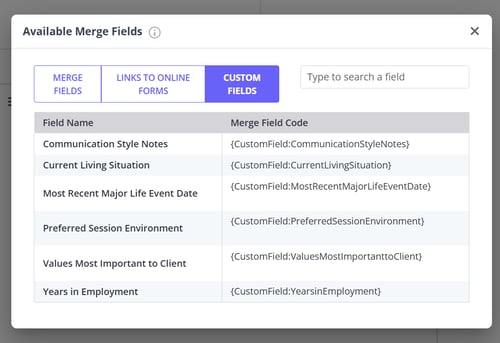 {CustomField:FundingType}) You can search by field name or code. - Copy the code and paste it on the template text where applicable.
