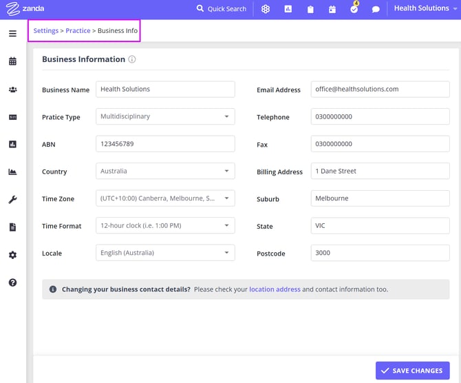 1. On the left-hand menu of your Zanda dashboard, navigate to Settings > Practice > Business Information.