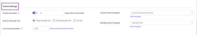 - Invoice Due Date: Select how many days after an invoice is created for it to be paid by. The invoice due date will be applied to all new invoices after selecting a due date. Look here for more details.