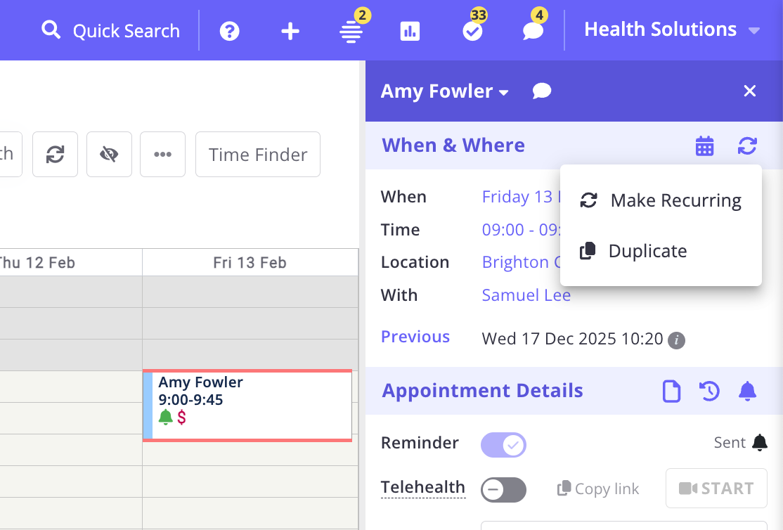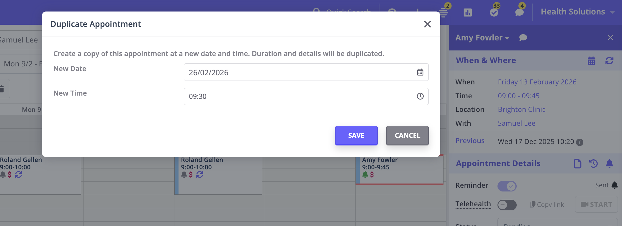 The Duplicate Appointment feature allows you to easily copy an existing appointment, creating a new appointment with all the details from the original one. This feature is designed to streamline the process of booking follow-up or repeat appointments by carrying over all relevant information while providing the option to update the date and start time.