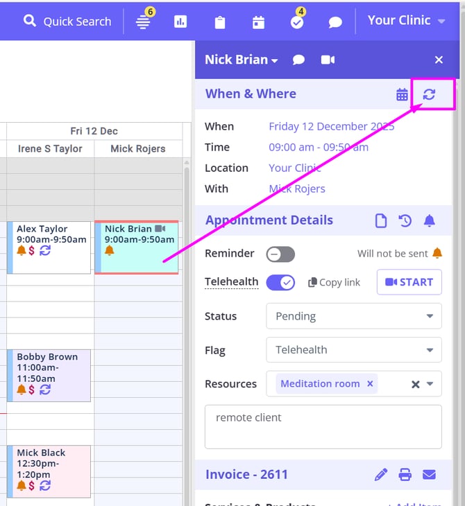 - Automatic Invoice Creation: The system automatically generates a new invoice for the duplicated appointment using the copied items. If the original appointment did not have an associated invoice, no invoice will be created for the duplicated appointment.