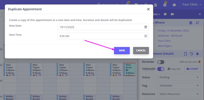 The Duplicate Appointment feature allows you to easily copy an existing appointment, creating a new appointment with all the details from the original one. This feature is designed to streamline the process of booking follow-up or repeat appointments by carrying over all relevant information while providing the option to update the date and start time.