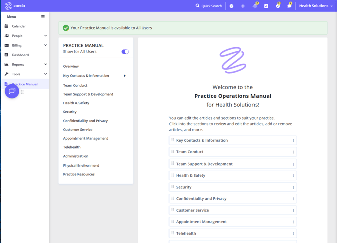 The Practice Manual contents provided by Zanda have been put together with the intention to help health practices prepare their own operations manual and create their own policies and procedures in an efficient manner. Please keep in mind that the pre-prepared content is general in nature and does not take into account your particular circumstances, including the relevant legal or regulatory authority requirements for your profession or local jurisdiction.