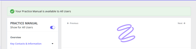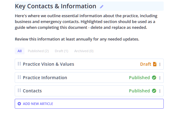 - We recommend that you review and edit the Practice Manual sections and articles first before you make them available to all users. Read further to learn more about this process.