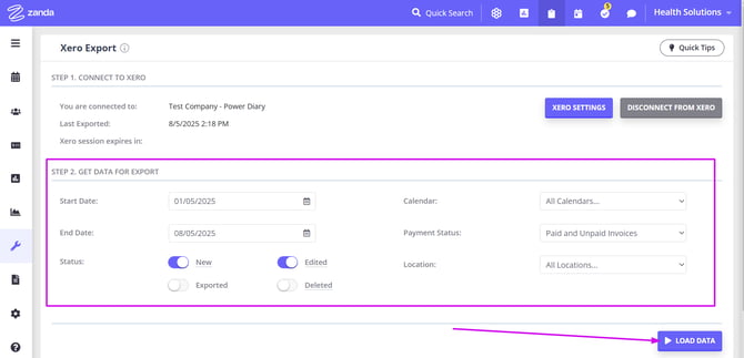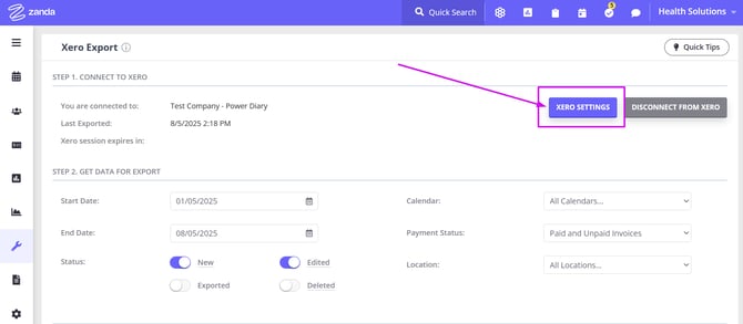 - Click the Xero Settings button at the top-right and configure your Xero integration settings in Zanda.