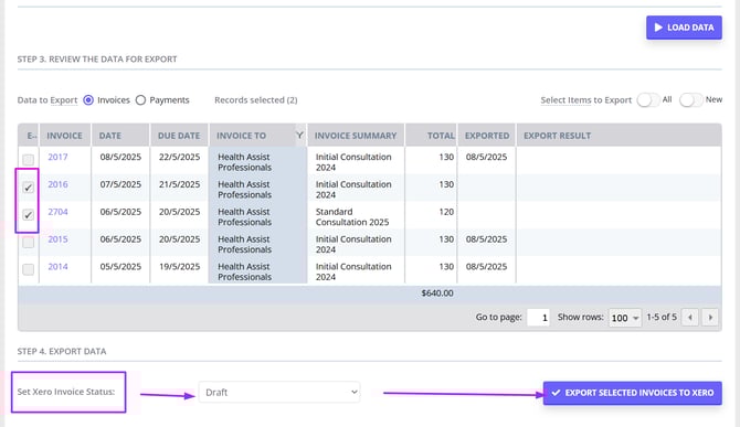 5. Click 'Export Selected Invoices To Xero.