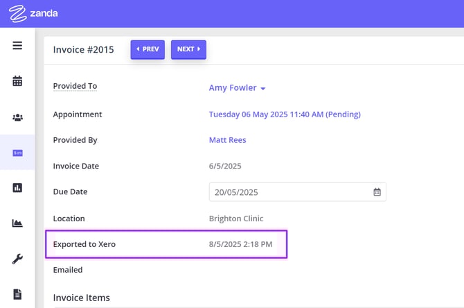 Later, if you want to confirm whether an invoice was exported, open the invoice in Zanda—it’ll display the export date and status.