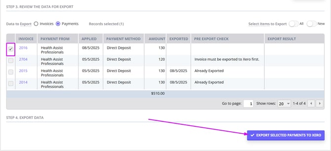 - The Pre-Export Check table on the payments tab tells you if an invoice has been exported yet for each payment. If not, export it first, then return and export the payments.