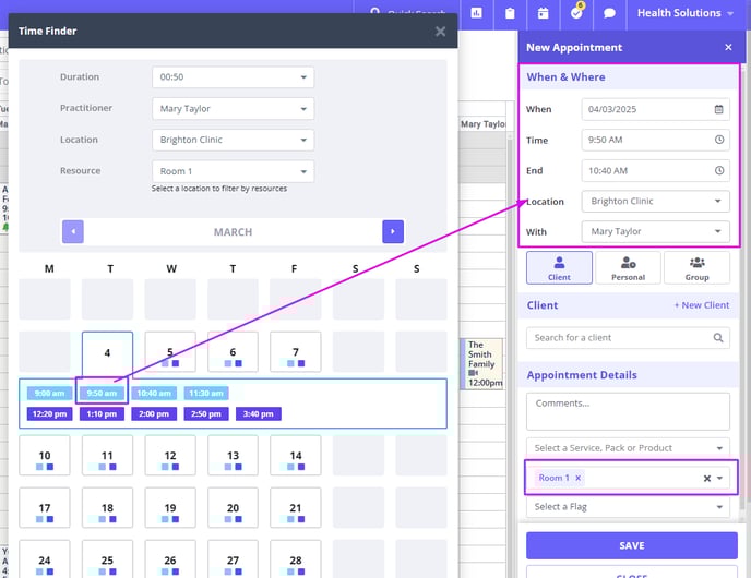 8. Close the time finder and use the new appointment panel to select the client and book the appointment for that resource item.