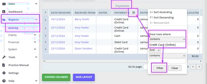 - Once the report is run, hover your mouse over the 'Payment Method' column and click the three bars to activate the filter option.