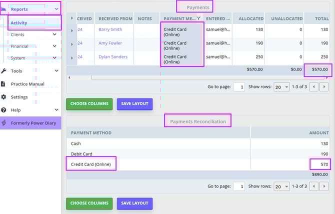 3. Or, scroll all the way down to its last section named 'Payments Reconciliation'. This section includes the list of payment totals that were collected using your available Payment Methods, including the Credit Card (Online) payments: