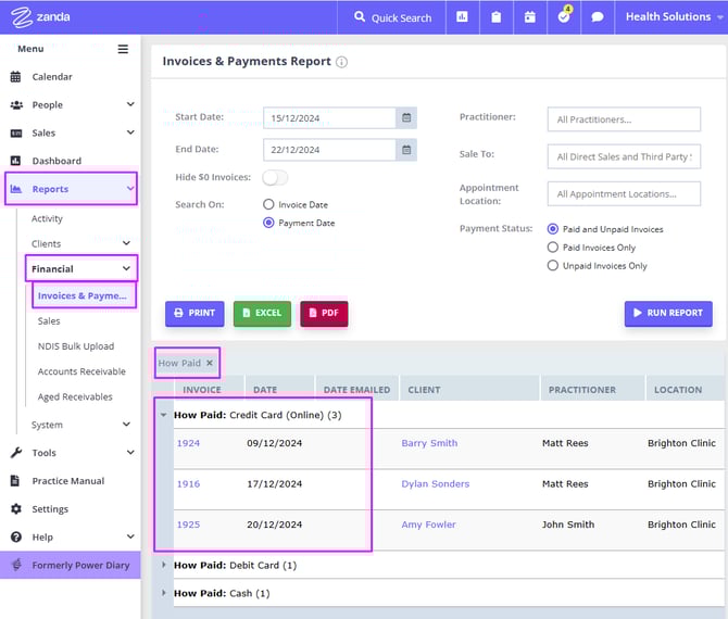 - Navigate to Reports > Financial > Invoices and Payments page and use the available filters to run the report.