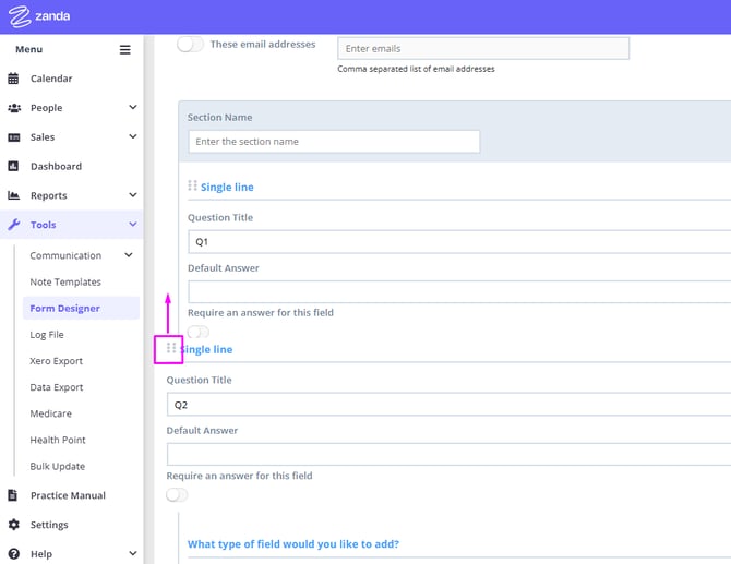 Grab the six dots in front of the question type above the question title to drag and drop the question to a different position, for reordering questions within the same template.