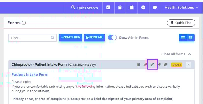 - When a form is in a draft mode, click on the Pencil icon on the top-right corner of a form window.