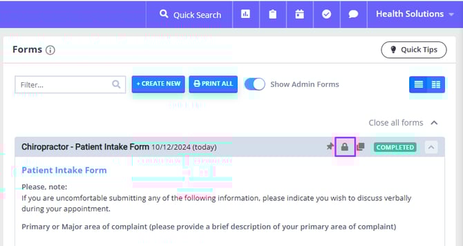 - On the Forms page, locate the form. If a form is already saved as completed, a master user of the account will be able to unlock it.