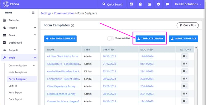 - Navigate to Tools → Form Designer or Settings > Communication > Form Designer