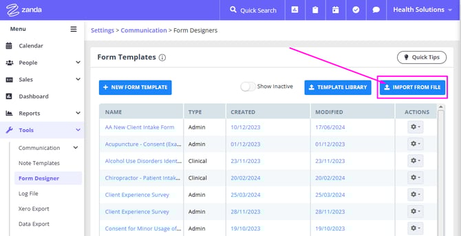 - From File: This is for importing templates from another Zanda account. Click on Import from File