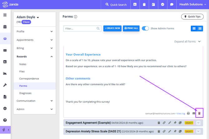 - Open client profile in Records > Forms or Admin > Admin Forms;