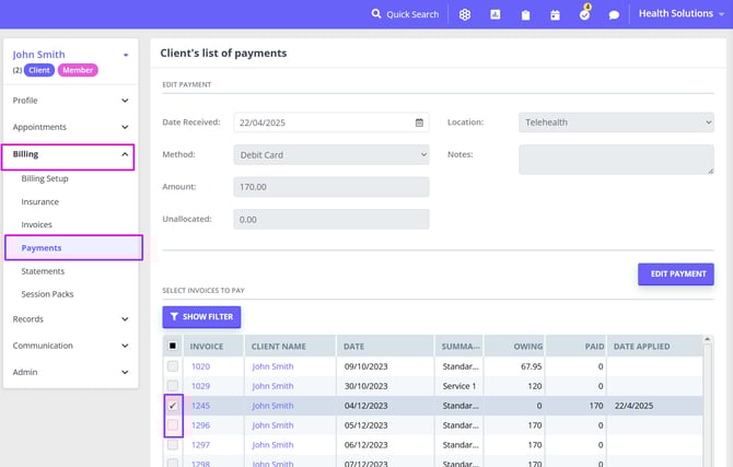 - Find the payment in question and click Edit.