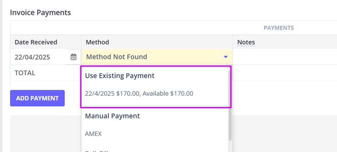 - You now will be able to click on Add Payment and select the Existing Payment