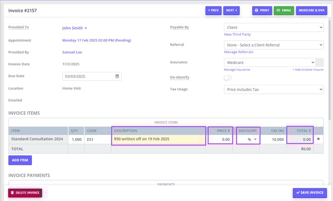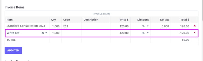 - Make a note in the Item Description field, such as "$x written off on (date)".