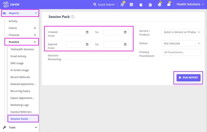 - Search for unused or unfinished session packs, to close them and follow up with clients.