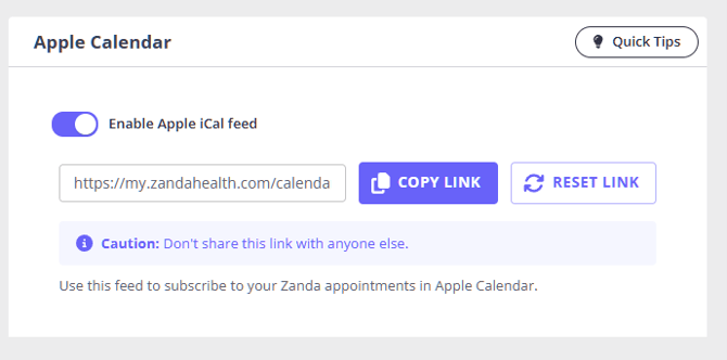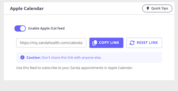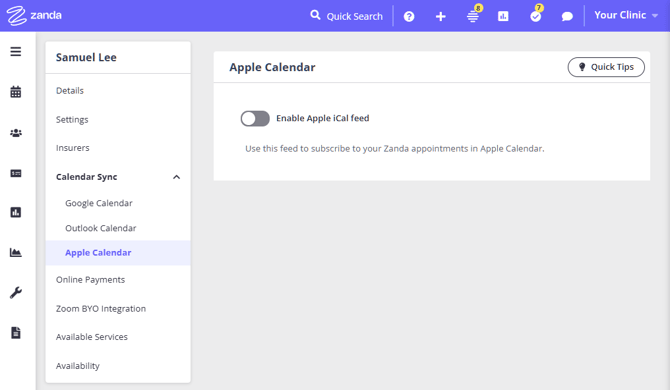 - In Zanda, navigate to your practitioner profile > Calendar Sync > Apple Calendar.