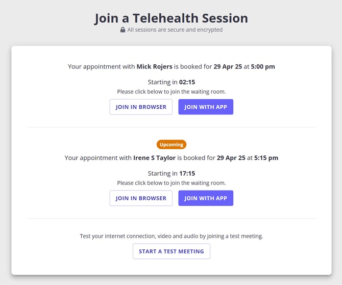 - If you have registered in your practice's client portal, you can easily access your telehealth session through the My Appointments list: