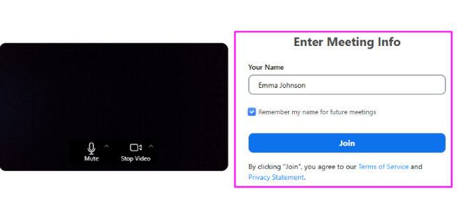 - Before you enter your first meeting, you will see the option to enter your name and save it for future meetings.
