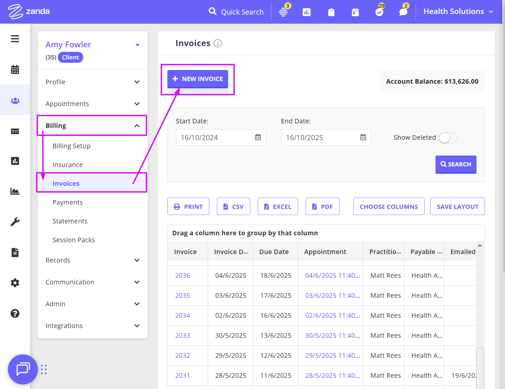 Invoices not attached to appointments can also be created in the client's invoices list.